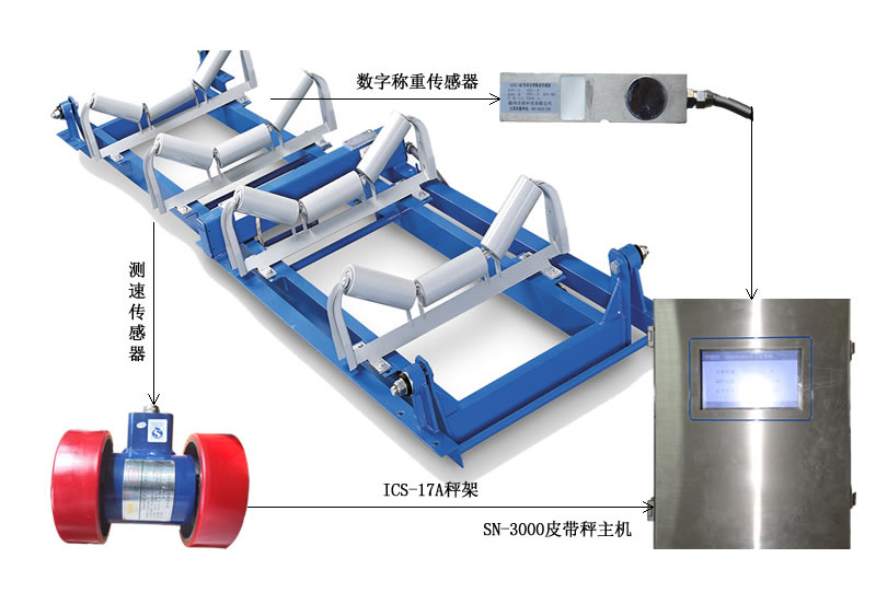 | 皮帶秤工作原理 ◆ 稱重橋架一般安裝于輸送架之上,物料作用一般在托輥之上,我們通過杠桿原理,將托輥將重量傳遞給稱重傳感器,傳感器生成正比于物料重量的電壓信號; ◆ 那么速度傳感器直接連接在大直徑測速滾筒上,當滾筒帶動皮帶旋轉時,測速傳感器將會產生一系列正比于速度的脈沖信號,這些信號傳遞給儀表, ◆ 經過積分計算,得出瞬時的物料質量,進過不斷地累積計算,從而得出整個皮帶上的物料質量,做到精確的動態稱重,然后顯示到儀表之上。 |